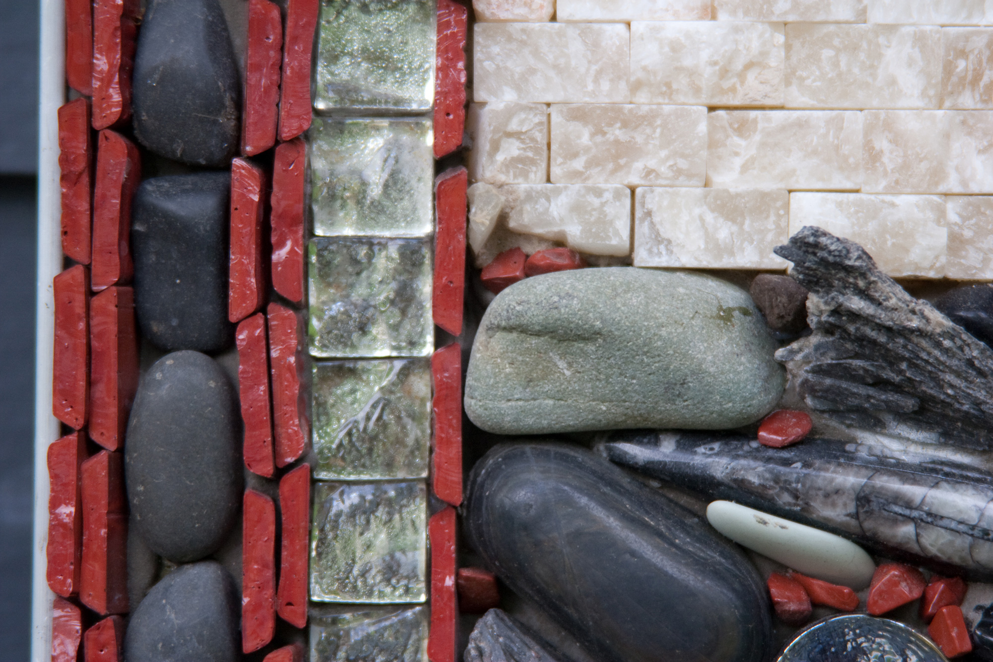 Connie was asked to create a sign for a home, Casa Magica. The home is wonderful—sleek, clean lines with a midcentury modern feel. It was important to Connie that the work complemented the home. Mission accomplished. The project was created with pebbles, chalcopyrite, orthoceras fossils, black kyanite, tourmaline, mirror and glass tile.