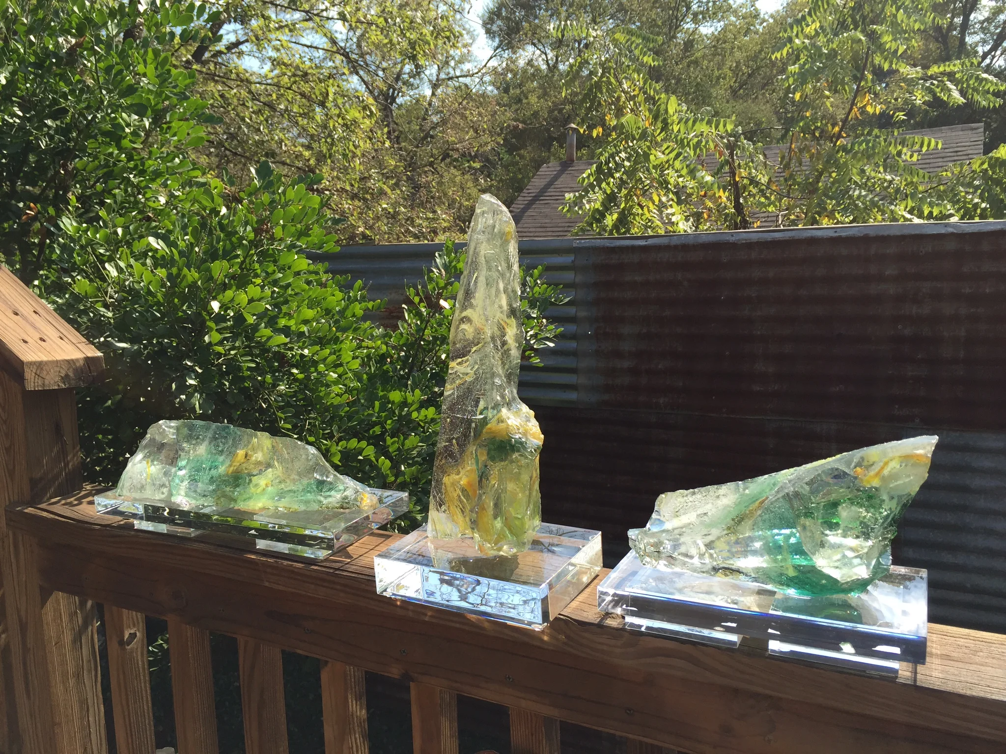 These pieces are green and gold slag glass mounted on lucite bases.
